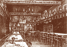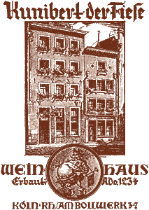 La vieille et petite auberge continua des réjouir le peuple tout ensemble. Combien de gens ont eût, dès leur premier jour, n´ont pas eu l´impression de se sentir parmi la clientèle habituelle. L´auberge des vins était le refuge des anti-conventionnels, des artistes, des étudiants et des intellectuels de Cologne. Ainsi l´auberge Hemerbach devînt " Zum goldenen Löwen " ( = Aux lions d´or ), " In den drei Römern " ( = Dans les trois Romes ), puis la maison vignoble " Zum grossen Schoppen " ( = Aux grosses chopes ), " Im Hessenland " ( = La Hesse ), et depuis 1879 " Kunibert der Fiese " ( = Kunibert le Méchant ). |